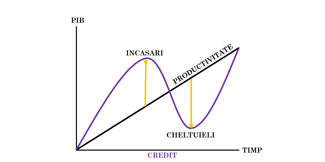 Graficul de mai jos iti arata cum functioneaza creditul. Atunci cand luam un credit, reusim sa crestem brusc incasarile, doar ca productivitatea nu creste la fel de brusc. Pe scurt, incasam mai mult decat producem. Asta inseamna ca incasam acum, bani din viitor. Teoretic este un lucru bun, dar practic inseamna ca in viitor va trebui sa cheltuim mai putin ca sa acoperim creditul. In realitate insa, treaba nu prea sta asa. Oamenii au tendinta sa cheltuie tot mai mult, si aproape niciodata nu accepta sa reduca cheltuielile atunci cand le merge bine. Uneori nici nu trebuie asta, daca si productivitatea ar fi influentata mai puternic.